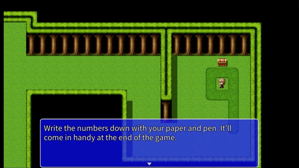 It’s not long after exploring this city that I come upon an annoyance. It’s a small gripe. I noticed that a lot of events won’t work properly unless you’re directly in front of it. There’s a lot of people you can’t talk to, signs you can’t read, or items you can’t interact with unless your facing it head-on. I’m a little rusty when it comes to RPG Maker, so I don’t exactly know what the reason for this could be, besides a conditional existing in the event which prevents the event from initiating unless the character is facing a certain direction or standing on a certain tile.